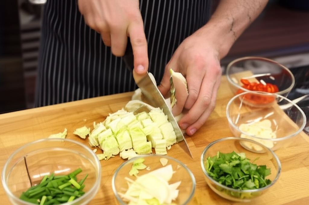 W tym czasie przygotuj dodatki do zupy: pokrój na plastry pozostałe chili i czosnek, młodą cebulkę, posiekaj kapustę pekińską, natkę kolendry.