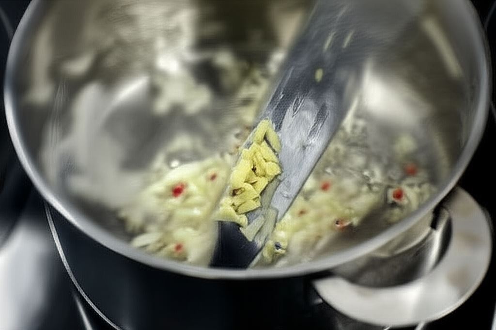 Cebulę, czosnek i paprykę chilli posiekaj na małą kostkę, potem zrumień w garnku na gorącej oliwie. Dodaj imbir.