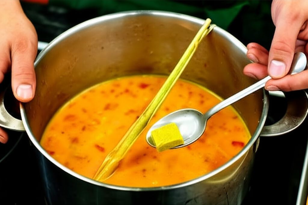 Doprowadź do wrzenia, wsyp kostkę Knorr, dodaj trawę cytrynową, potem zredukuj ogień i gotuj przez 10 minut.
