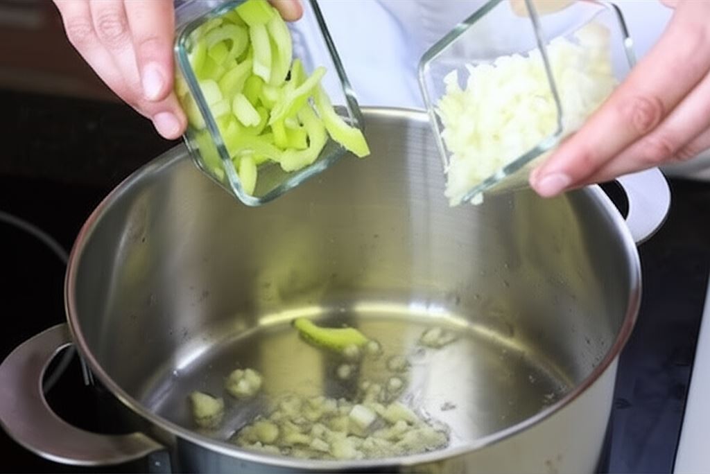 Przesmaż na oliwie oliwkowej: selera, pomidory, cebulę i czosnek przez około 3 minuty.