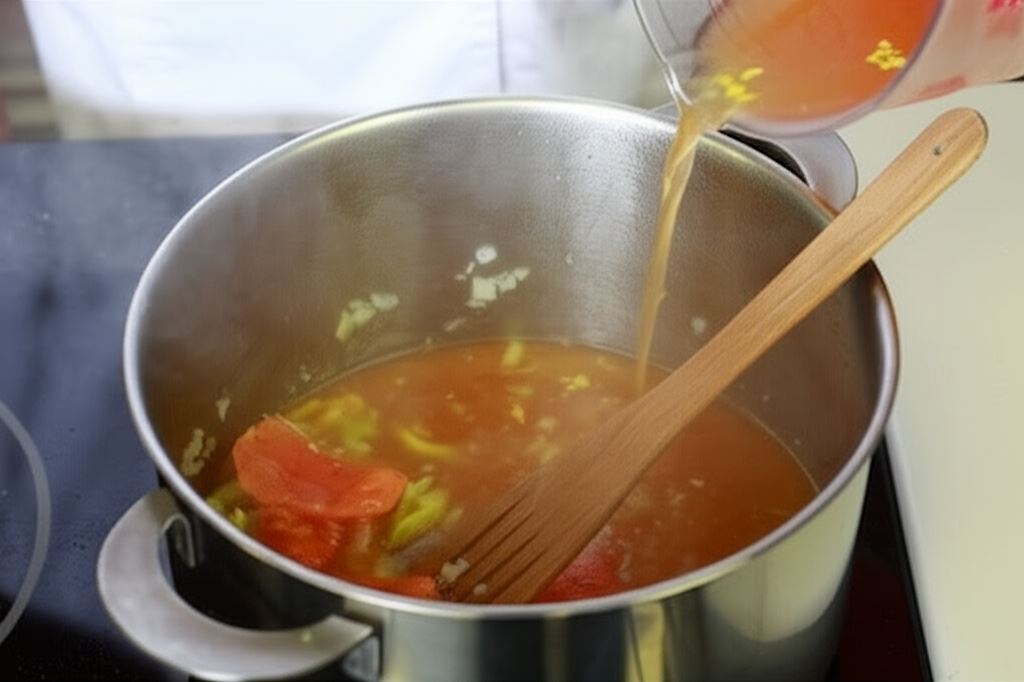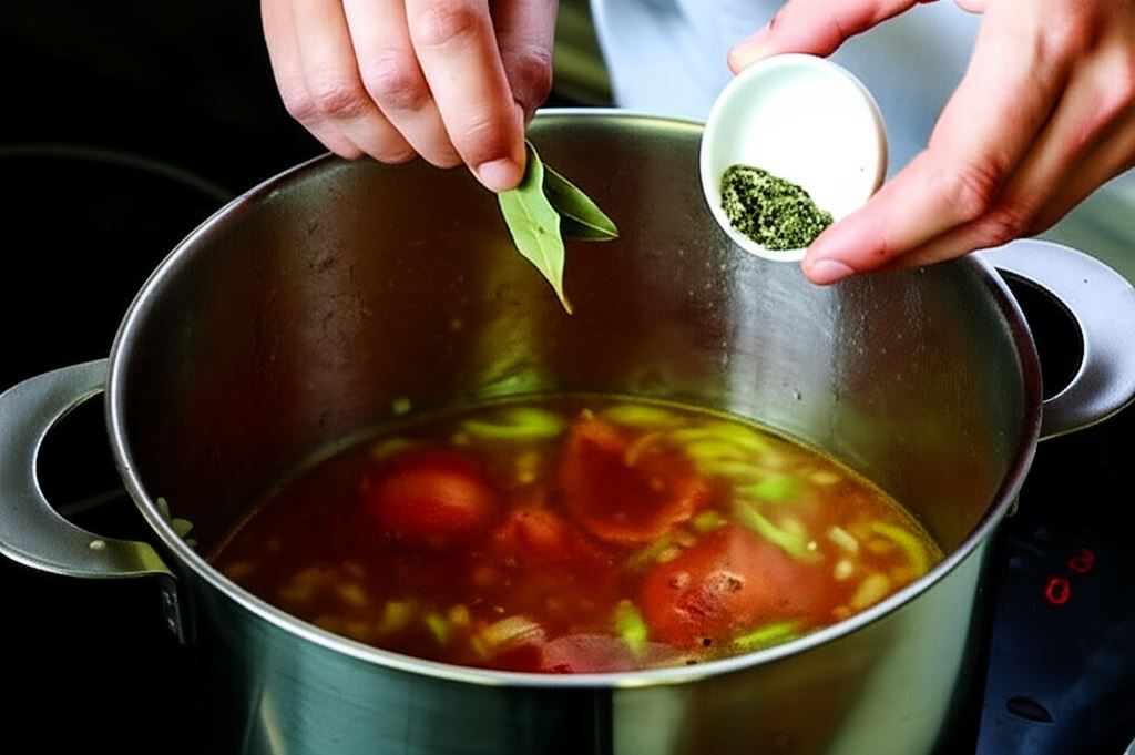 Wlej bulion i zioła, następnie gotuj na średnim ogniu przez około 10 minut.