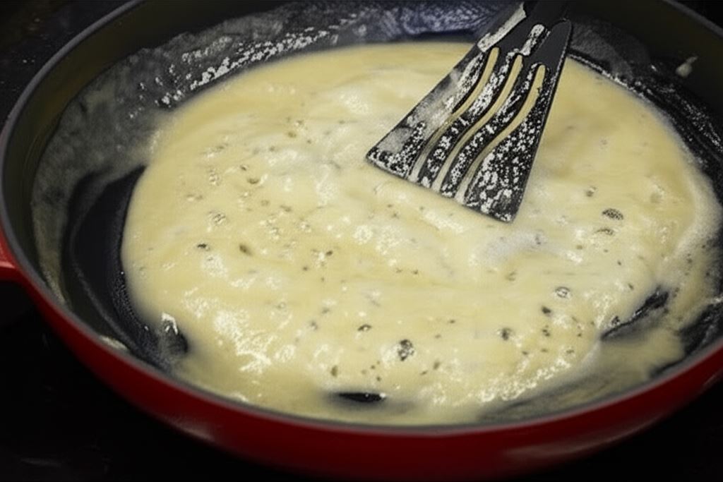 Rozgrzej masło na patelni, wymieszaj z mąką dokładnie. Uzyskaną zasmażkę trzymaj na ogniu przez kolejne 2–3 minuty, mieszając cały czas. Odstaw na bok, aby wystygła.