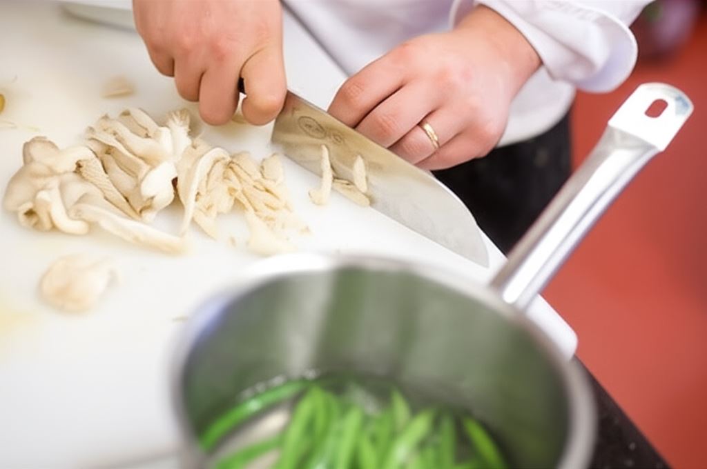 Boczniaki pokrój w paski, ugotuj w bulionie. Odetnij końcówki fasolki szparagowej i ugotuj w osolonej wodzie.