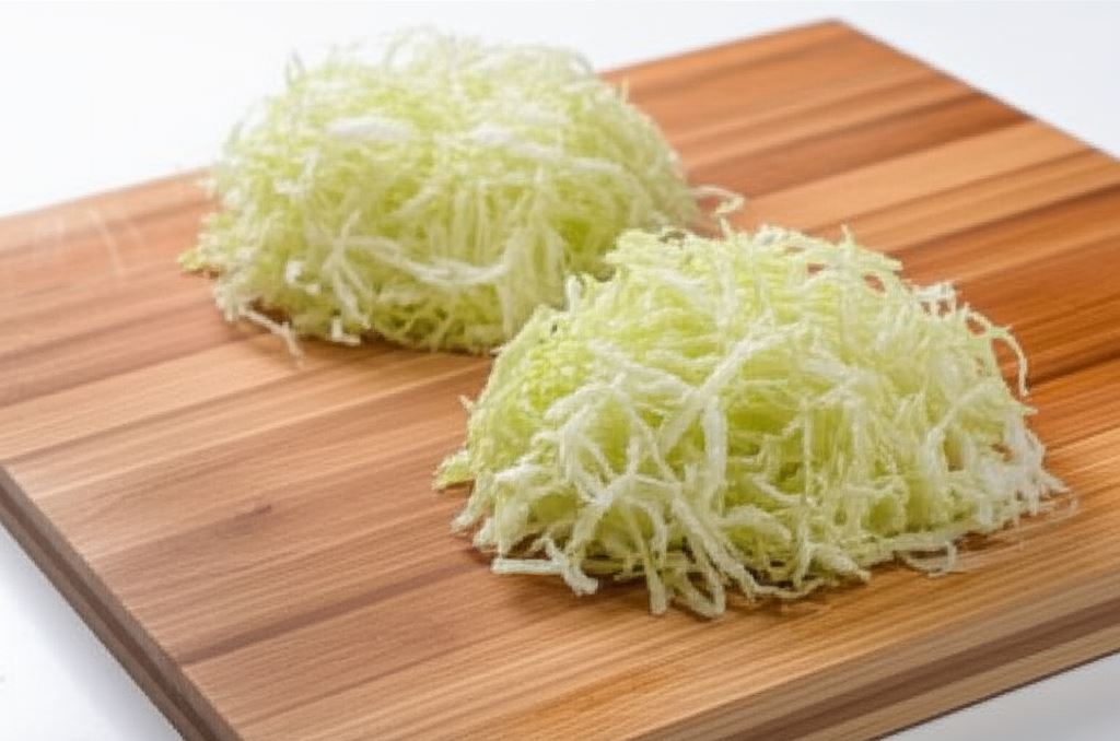 Kapustę poszatkuj na cienkie paski. Zielony groszek odmroź.
