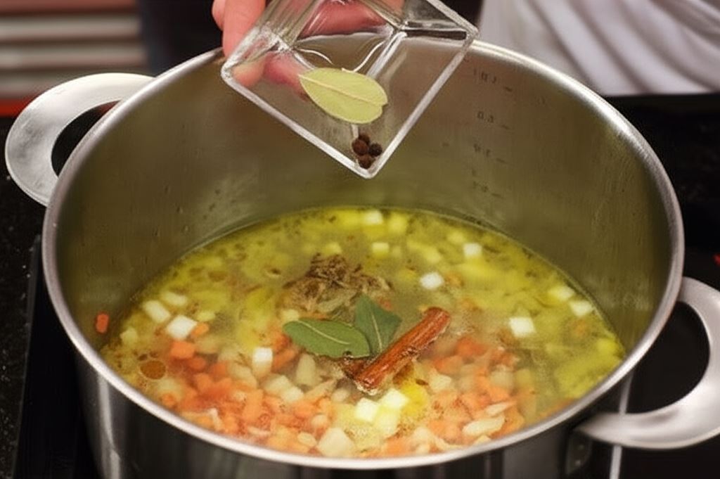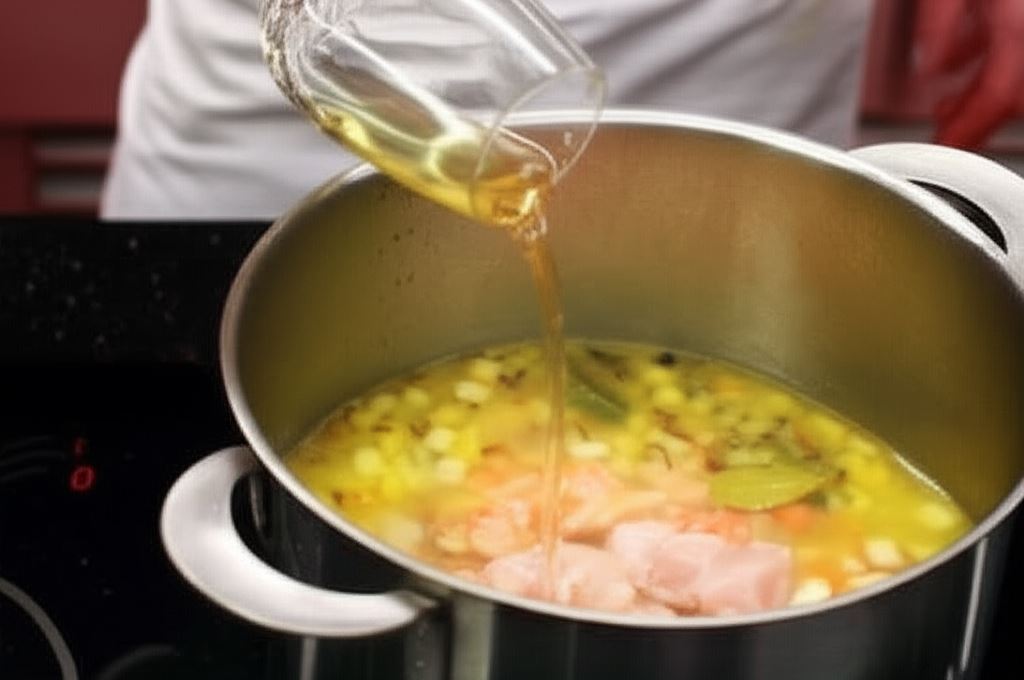 Bulion gotuj przez godzinę, aż warzywa będą miękkie. Dodaj ryby pokrojone w kostkę i szklaneczkę wermutu.