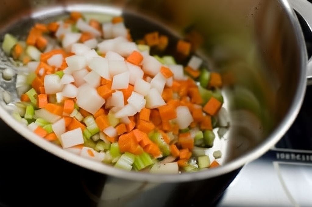Wszystkie warzywa obierz, oczyść, i pokrój w drobną kostkę. Potem przysmaż je w dużym garnku na oliwie, posyp mąką i wlej 1,5 l wody. Zupę doprowadź do wrzenia i gotuj około 40 minut – aż do momentu, gdy warzywa staną się miękkie.