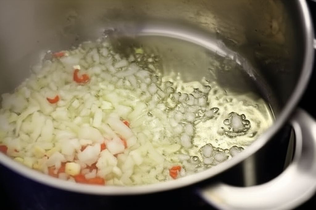Czosnek, chili i cebule drobno posiekaj. Na połowie oliwy podsmaż.