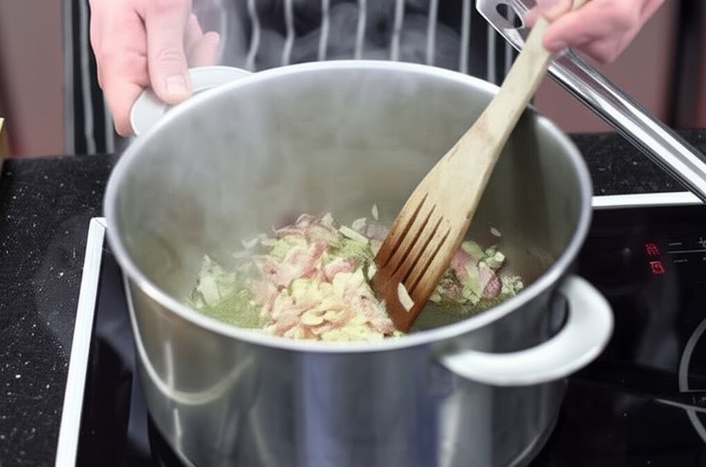 W drugim garnku zrumień na oliwie posiekaną w małą kostkę cebulę i boczek.