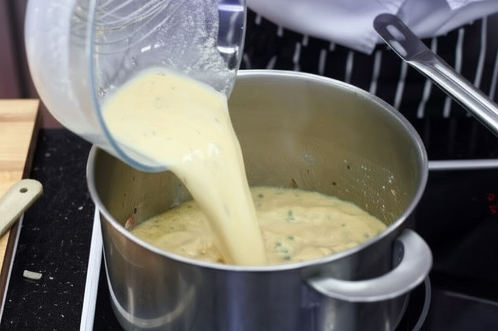 Kiedy boczek zrumieni się, dodaj zupę i starannie zamieszaj.
