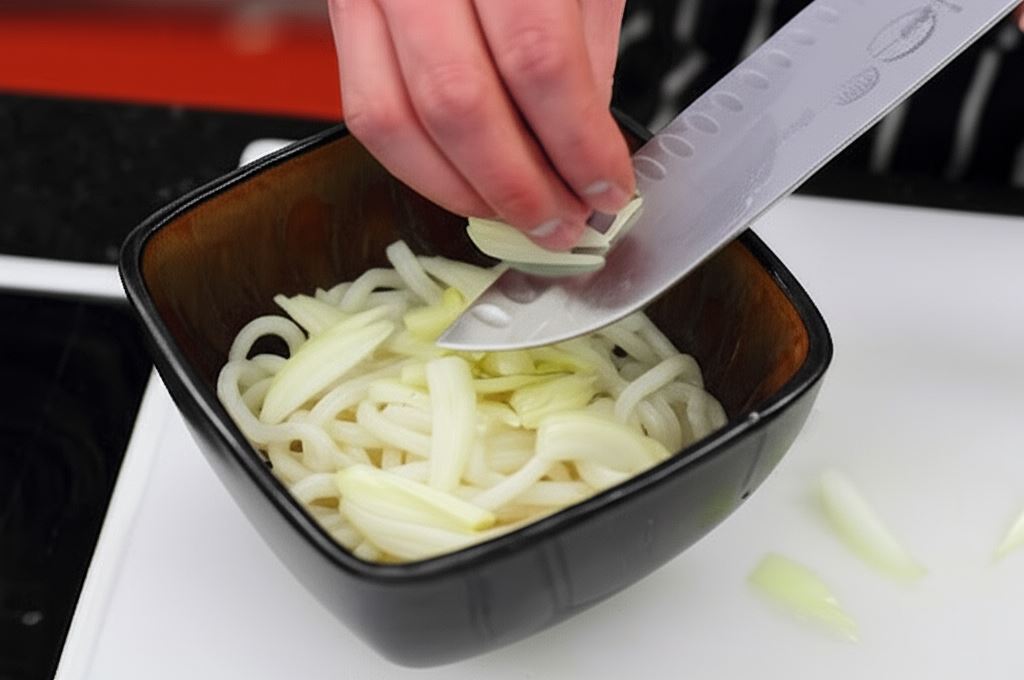 Po ugotowaniu odcedź i przełóż do miseczek. Dodaj także posiekane białe części dymki.