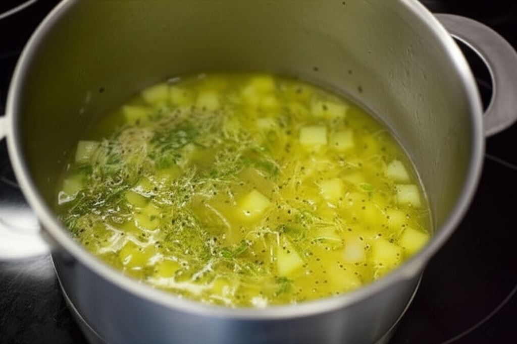 Pokrojone w kostkę ziemniaki ugotuj w wodzie z kostką Bulionu na włoszczyźnie Knorr. Równocześnie ugotuj także makaron.