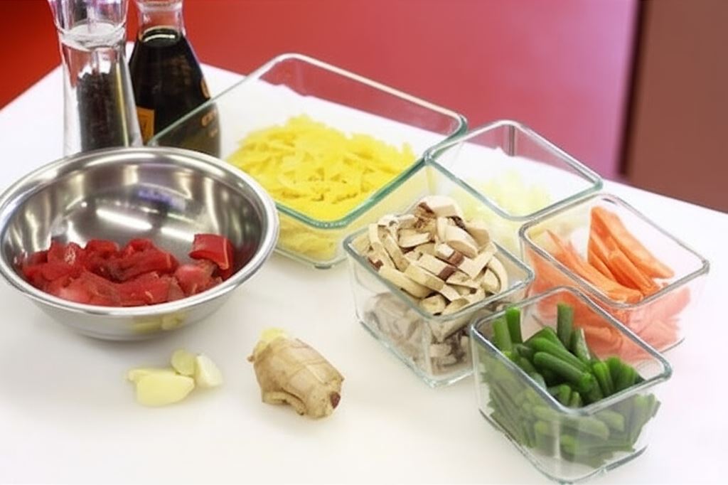 Podziel wołowinę na drobne kawałki, następnie pokrój i opłucz pieczarki. Opłucz i obierz fasolkę szparagową, marchewki poszatkuj w cienkie paski mające długość około 4 centymetrów.