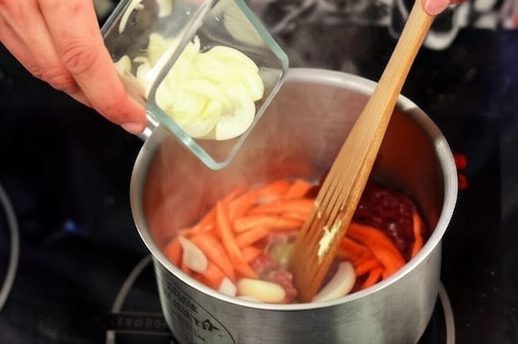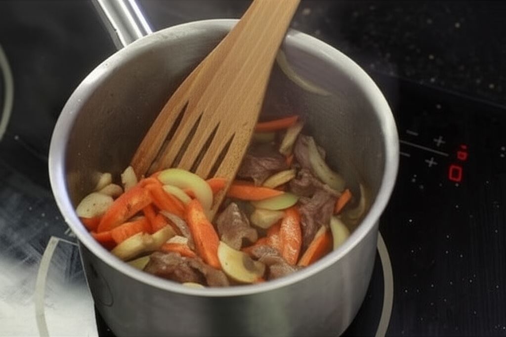 Roztop masło na średnim ogniu w garnku o grubym dnie. Wsyp do niego mięso, marchewkę, pieczarki i cebulę. Obsmaż je na złoty kolor przez około 7 minut, nieustannie mieszając. Trzeba pilnować, aby masło nie przypaliło się, w przeciwnym razie danie będzie niesmaczne i szkodliwe.