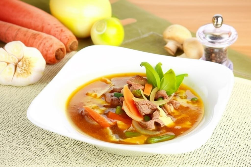 Rozgrzewająca zupa wołowa to prawdziwa uczta dla zmysłów! Soczyste kawałki wołowiny, chrupiące warzywa i delikatny makaron tworzą harmonijne połączenie, które rozgrzeje każde podniebienie. Bulion wzbogacony sosem sojowym i aromatycznymi przyprawami nadaje potrawie głęboki, wyrazisty smak, który długo pozostaje w pamięci.