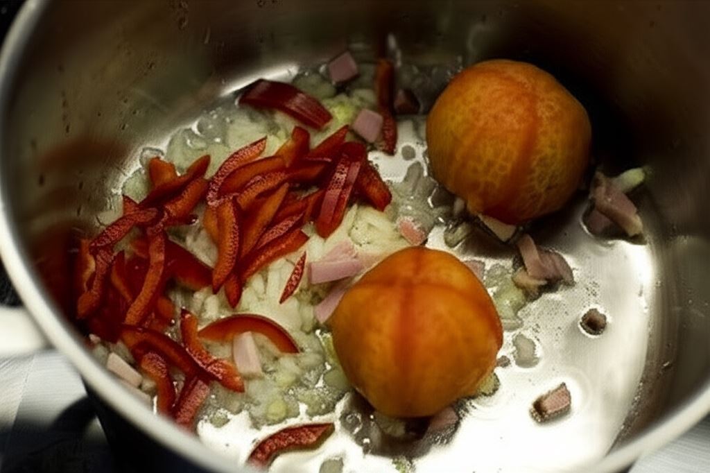 Na tłuszczu zrumień posiekaną cebulę i boczek pokrojony w kosteczki. Wsyp pokrojoną w paski paprykę oraz pomidory bez skórki.
