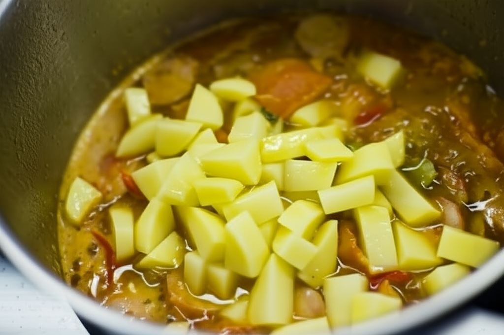 Wrzuć do zupy ziemniaki oraz liść laurowy. Gotuj około 20 minut, dopóki ziemniaki będą miękkie.