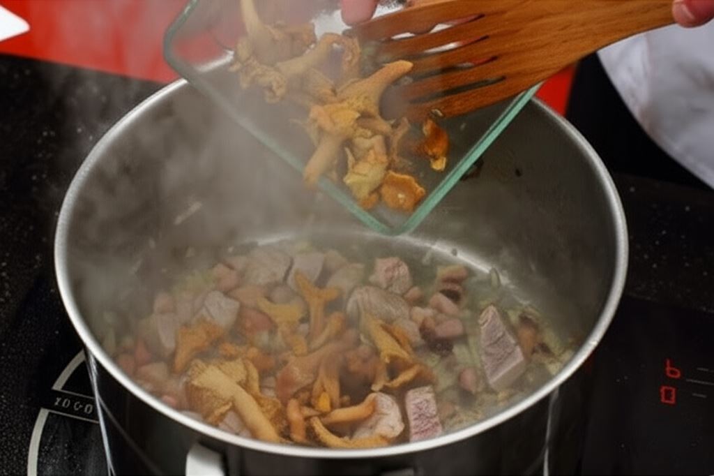 Mięso potnij w kostkę. Boczek i cebulę pokrój w drobną kostkę, a kurki opłucz i przetnij na pół. Wszystko razem podsmażaj w garnku.
