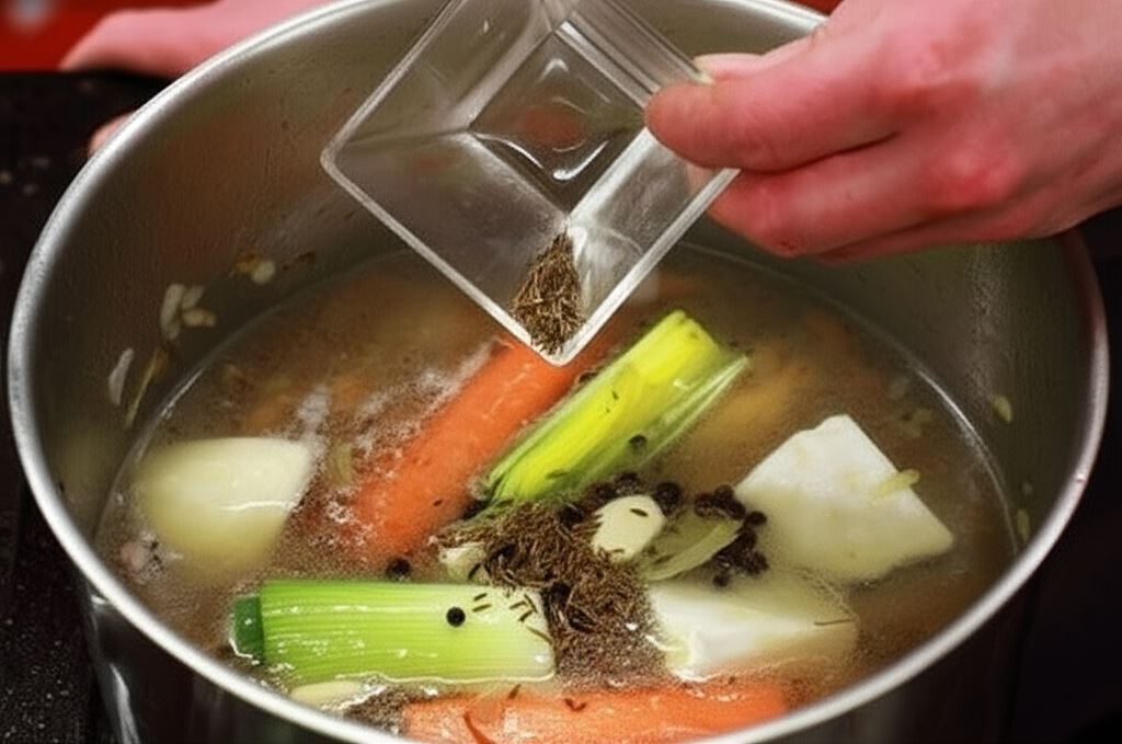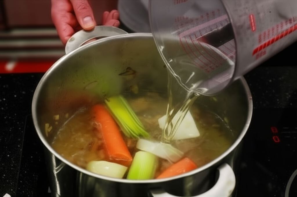 Bulion gotuj powoli około 2 godziny. Potem wyjmij duże kawałki warzyw.