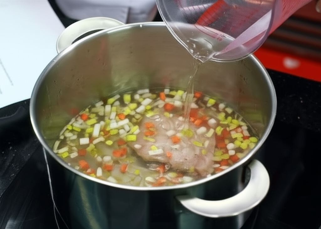 Warzywa obierz, pokrój w kostkę i wraz z żeberkami zalej około 1,5 litra zimnej wody. Zagotuj do wrzenia, po czym zbierz utworzoną pianę.