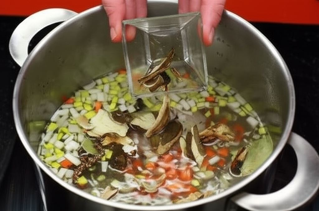 Wsyp ziele angielskie, liść laurowy, kminek, suszone grzyby i pieprz. Gotuj bulion powoli przez około godzinę.