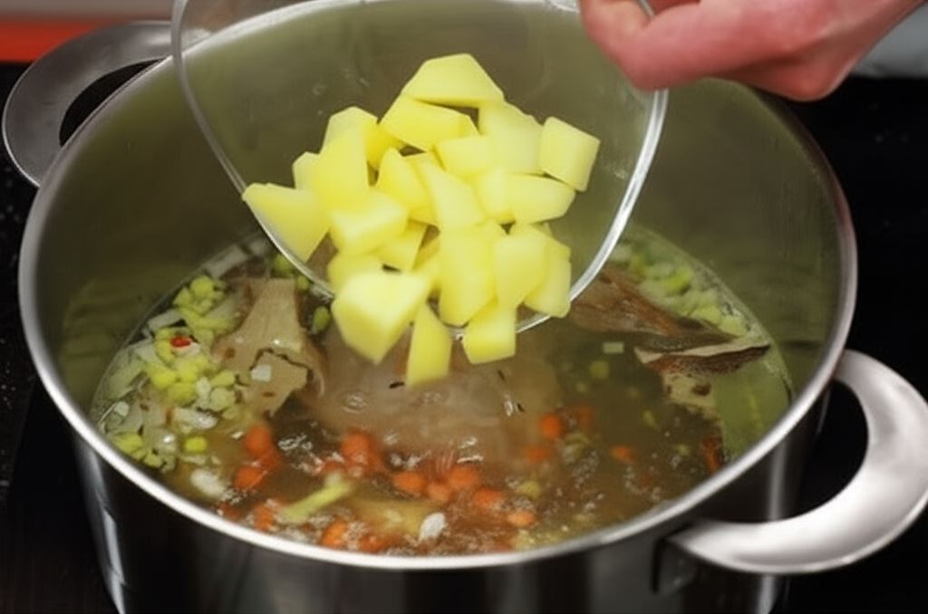 Obierz ziemniaki i pokrój w kostkę. Wrzuć je do wywaru i gotuj aż będą miękkie.