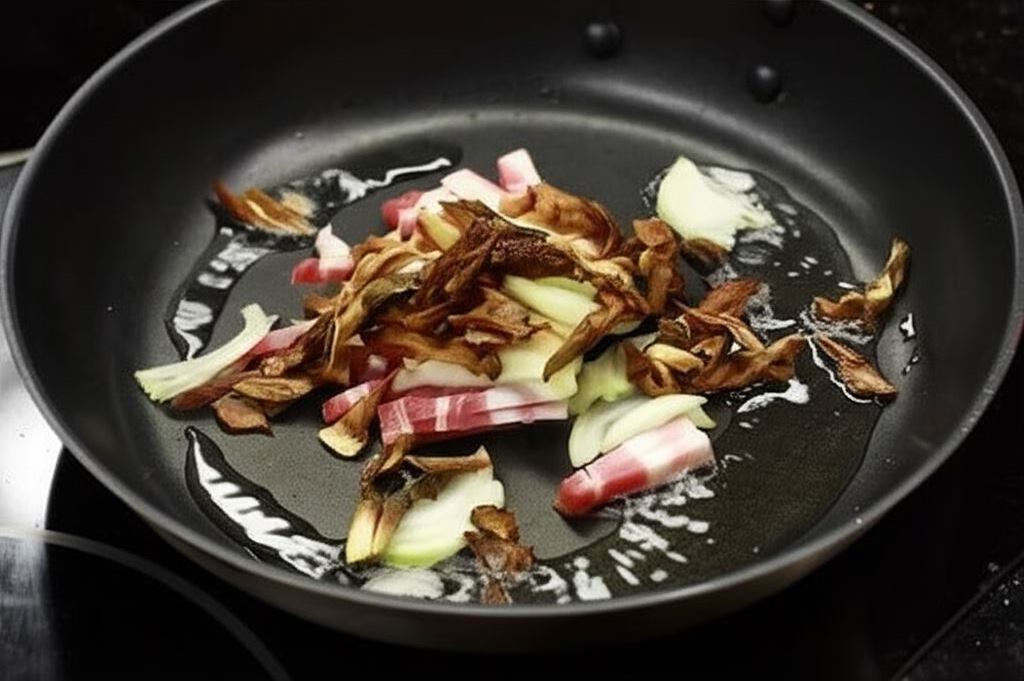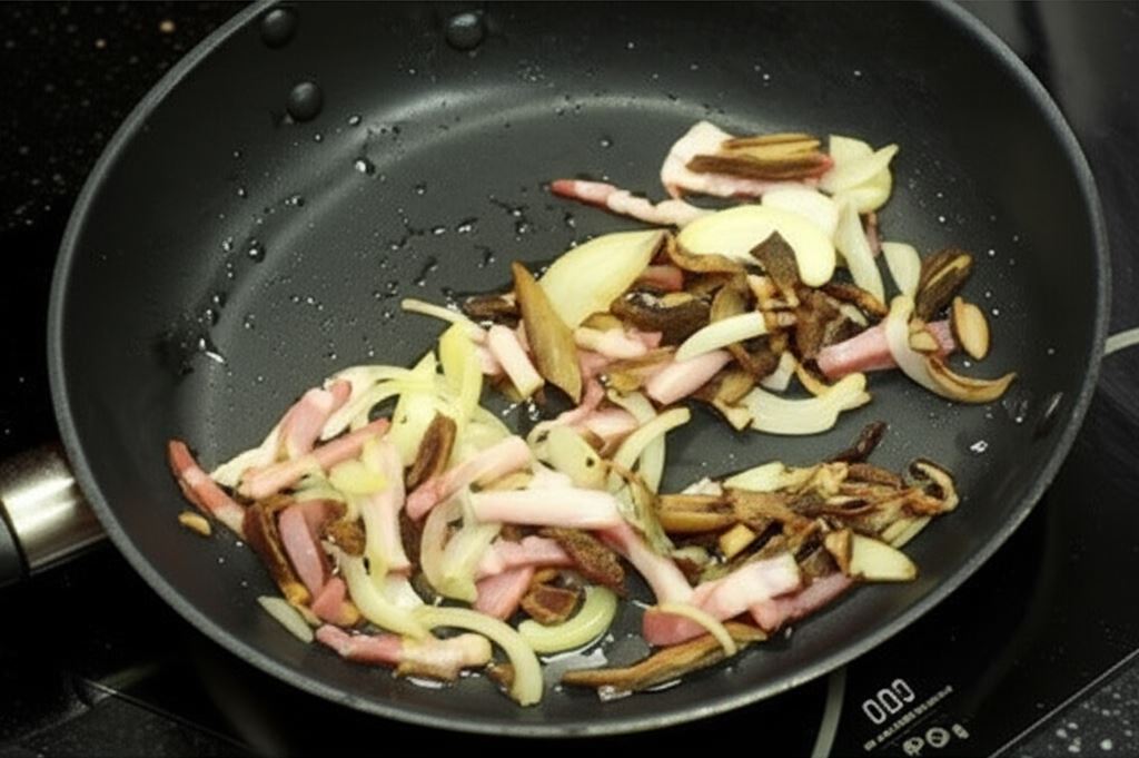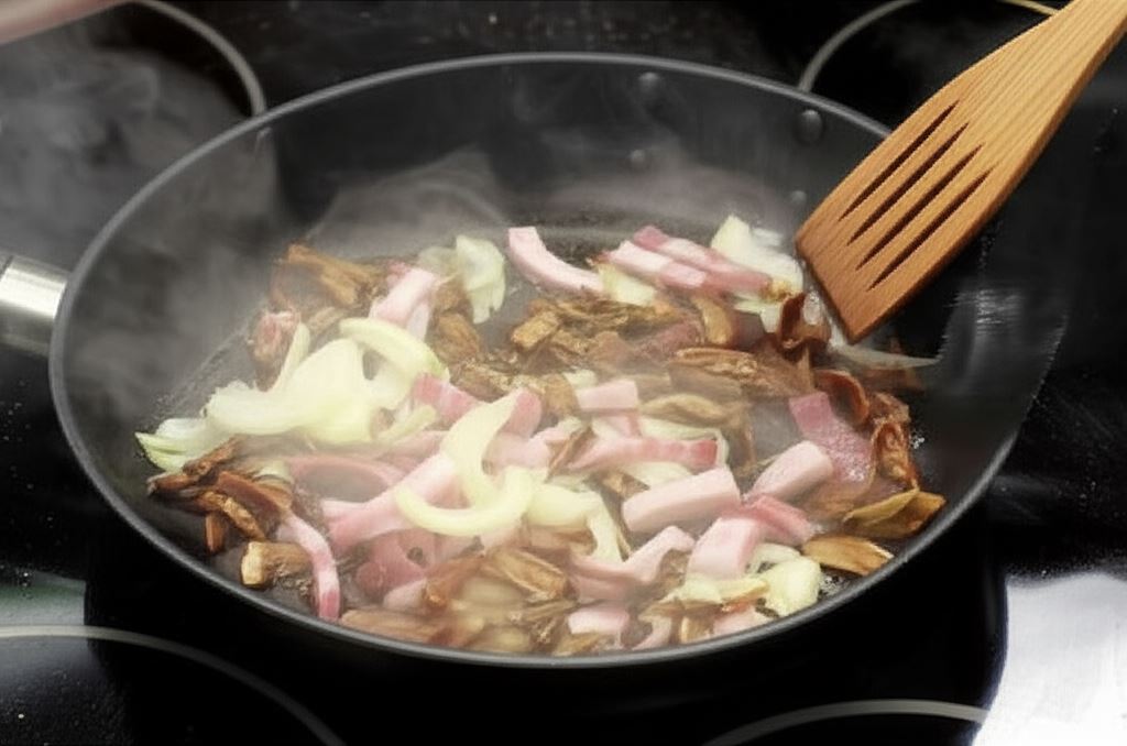 Boczek drobno posiekaj, zrumień z cebulą i pieczarkami (suszone grzyby uprzednio zalej wrzątkiem, posiekaj i zrumień z boczkiem), następnie przełóż z powrotem do wywaru.
