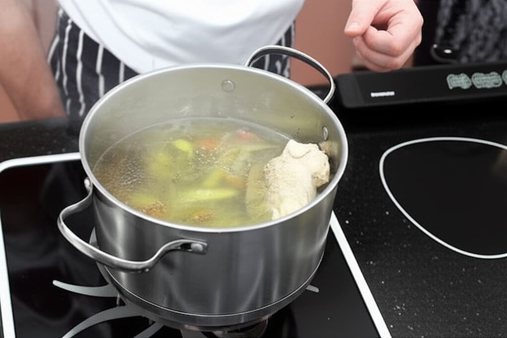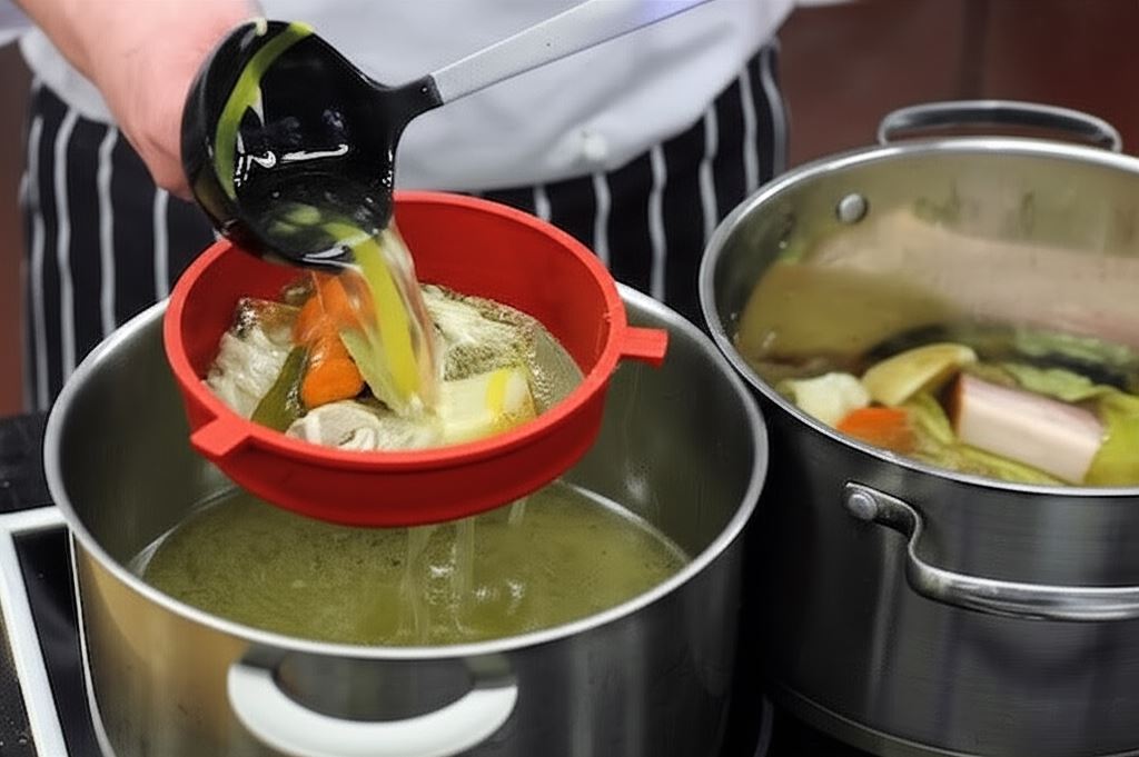 Wsyp przyprawy i gotuj na niskim ogniu przez około godzinę. Potem przecedź wywar, warzywa odrzuć.