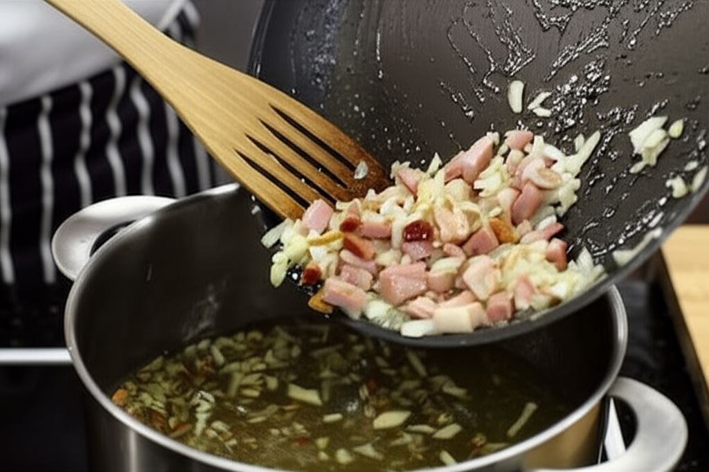 Pokrój boczek i podsmaż z cebulą, potem dodaj do wywaru.
