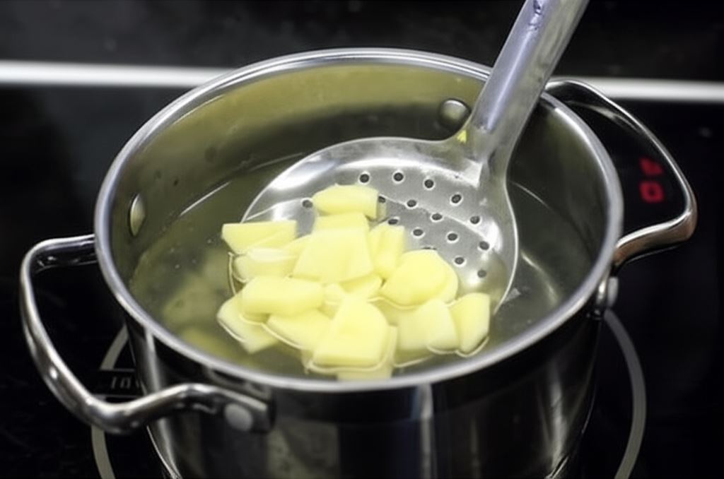 Ziemniaki obierz, potnij na kawałki i ugotuj w 600 mililitrach wody.