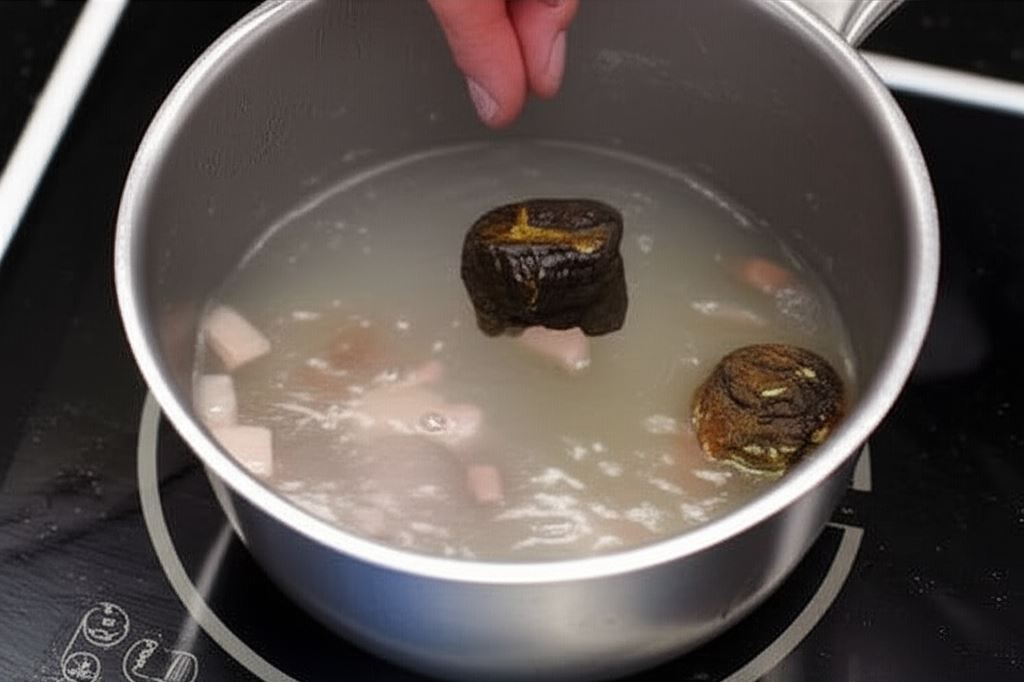 Pokrój boczek w kostkę i wraz z suszonymi podgrzybkami dodaj do 650 mililitrów wrzącej wody i gotuj przez około 5 minut.