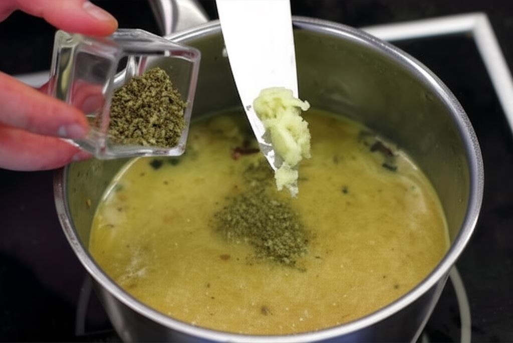 Przepuść czosnek przez praskę i razem z majerankiem wsyp do zupy. Wszystko starannie zamieszaj i gotuj przez kolejne 5 minut.