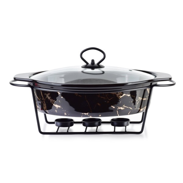 Свічка для чайних свічок Modern Kitchen об'ємом 1,6 л для подачі теплих страв (33,1 x 22,2 x 7 см) вирізняється поєднанням функціональності та естетики. Виготовлена з високоякісної кераміки, вона стійка до високих температур та довговічна для щоденного використання. Металевий каркас, призначений для розміщення трьох свічок, забезпечує рівномірний та тривалий нагрівання без потреби в електриці, що особливо практично для вечірок та зібрань на свіжому повітрі або там, де доступ до електрики обмежений. Скляна кришка допомагає зберегти аромат та свіжість їжі та запобігає накопиченню пилу та бруду. Елегантний чорний дизайн доповнює як сучасний, так і класичний інтер'єри, покращуючи естетику будь-якого столу. Виріб легко миється, а його стабільна конструкція забезпечує безпеку під час використання.