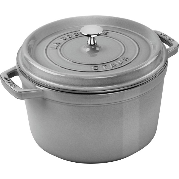Гарячий чавунний каструля Staub La Cocotte, кругла, 4.8 л, графітова для смачних страв — універсальна та надійна каструля для приготування страв на плиті та в духовці. Вона підходить для тушкування, запікання, смаження та подачі страв прямо на стіл, зберігає тепло та рівномірно його розподіляє, що забезпечує інтенсивний смак та ніжну текстуру страв.