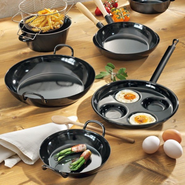 - Чавунні сковорідки – ідеальні для рівномірного нагріву та тривалого зберігання тепла. Вони міцні та довговічні, проте важкі і вимагають правильного догляду для запобігання корозії.