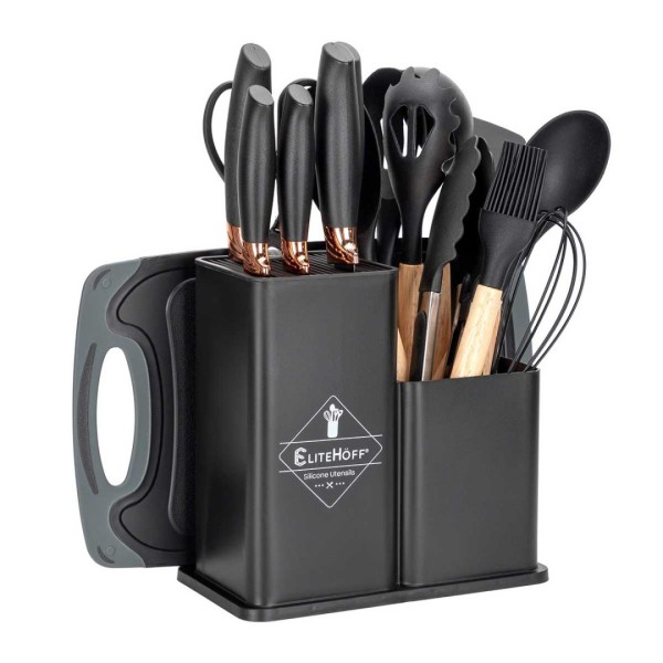 Zestawy noży Elitehoff są projektowane z naciskiem na estetykę i wygodę. Noże wykonane są z wysokogatunkowej stali nierdzewnej, co zapewnia ostrzom trwałość i odpowiednią ostrość. Rękojeści są ergonomicznie ukształtowane i często posiadają elementy dekoracyjne imitujące marmur lub metal, co nadaje im luksusowy charakter. Kluczowym wyróżnikiem jest estetyka przechowywania: zestawy są umieszczane w eleganckich, nowoczesnych blokach akrylowych lub obrotowych, które stanowią funkcjonalny i dekoracyjny element blatu kuchennego. Komplety zawierają wszystkie niezbędne noże (szefa kuchni, do chleba, Santoku, uniwersalny, itp.), zapewniając kompleksową gotowość do każdego zadania.